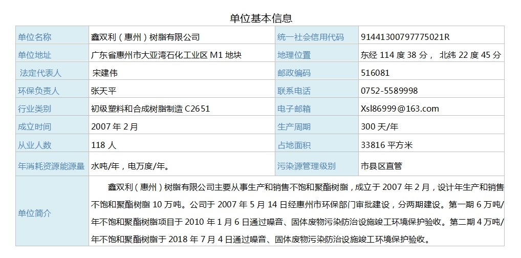 鑫雙利(惠州)樹脂有限公司固體廢物信息公開表